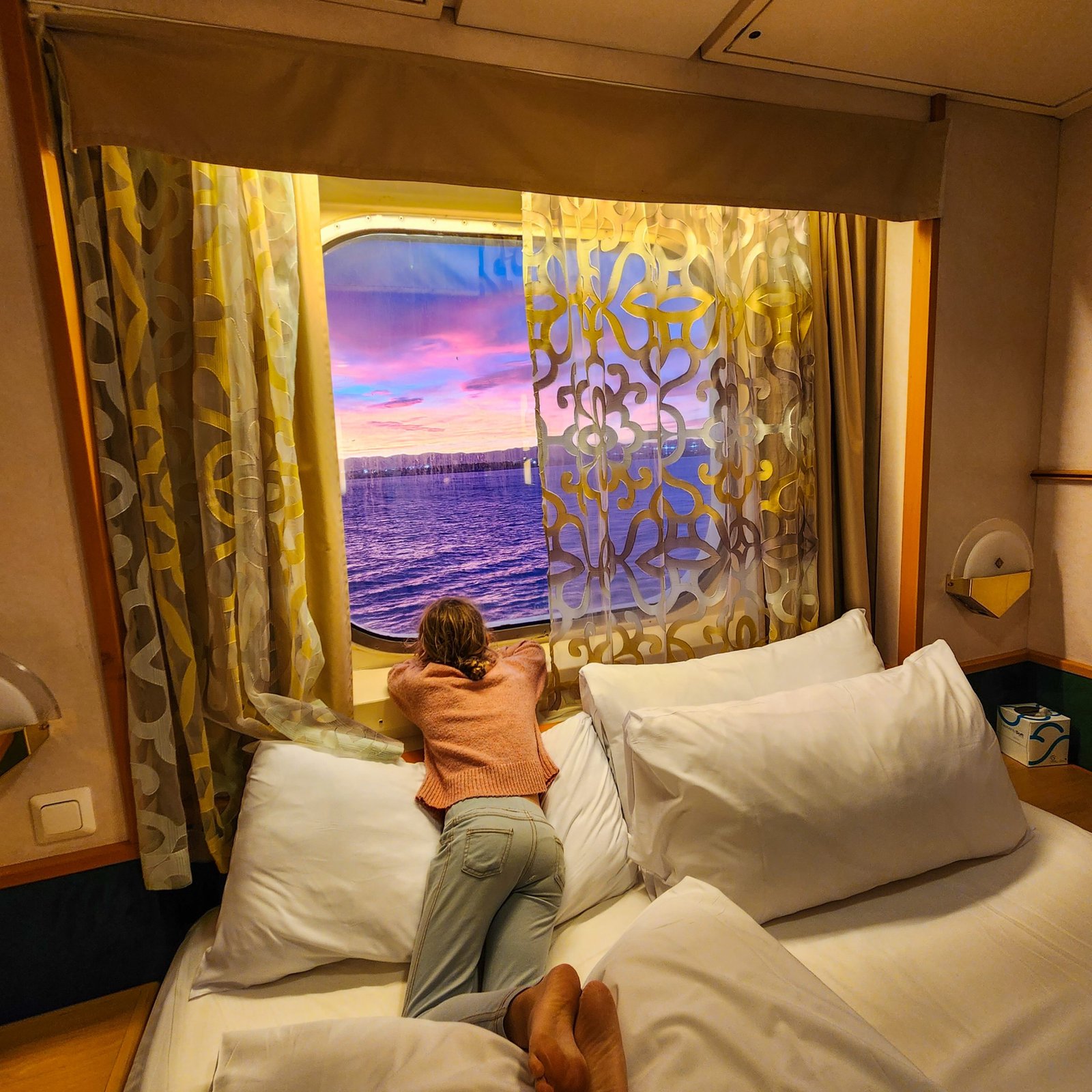 So a 14 night Transatlantic cruise leaving from Barcelona, with 3 port stops and 6 days at sea all at once across the Atlantic Ocean (other sea days between ports too). I do get seasick so we booked a room as low as possible and as centre as possible with a window to help reduce the motion as much as possible. We also booked just the one room with the double bed and bunk for Aria.